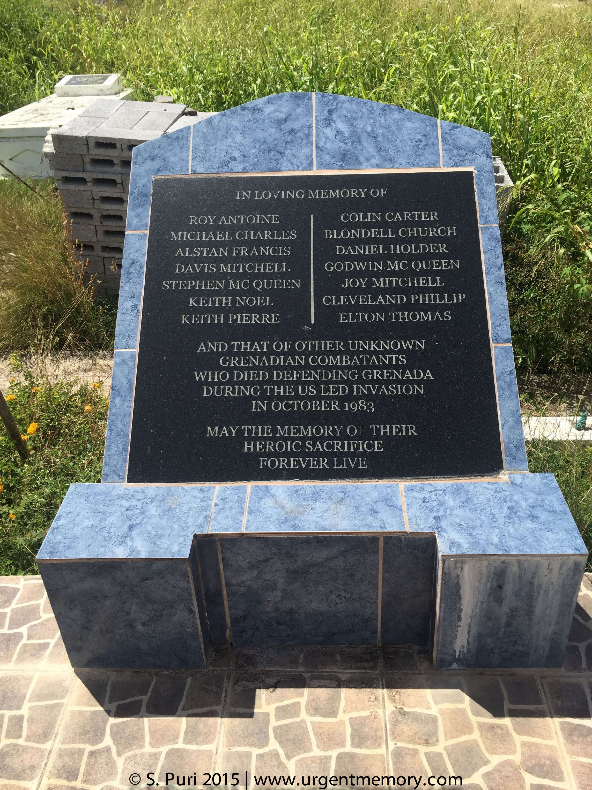 Twenty-five years after the US invasion, on October 25, 2013, this small headstone was unveiled. It is the first memorial in Grenada to Grenadians killed in the US invasion. In 1983, the US Military had mistaken the bodies of the 14 soldiers named on the headstone for Cubans and shipped them to Cuba. The Cubans had returned the bodies to Grenada, where they were buried in an unmarked grave. The headstone honors them by name and alludes to unknown others who died during the invasion.