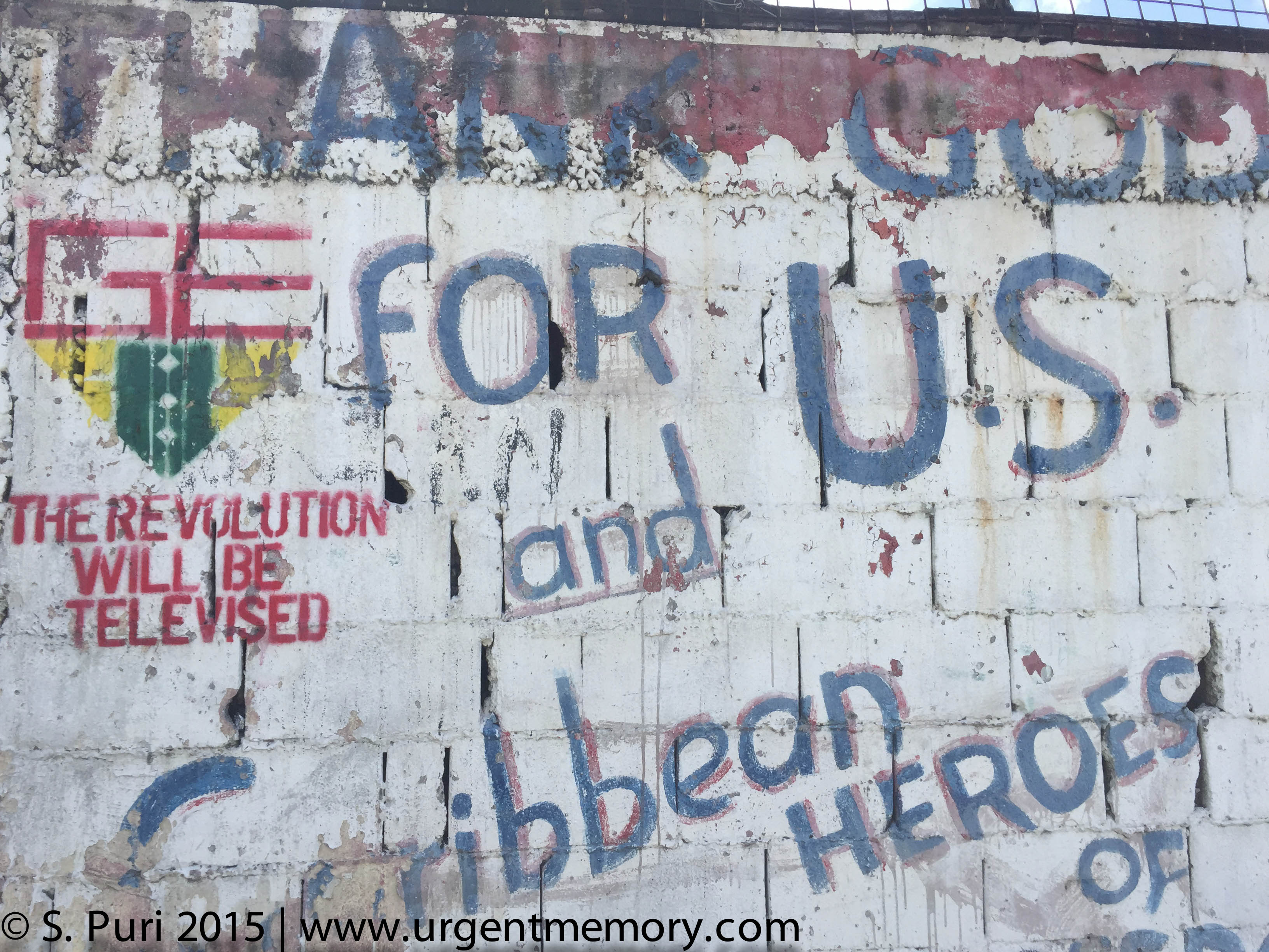 The Writing on the Wall March 2015 Posted on March 1, 2015 by purishalini Below, a mischievous addition to the graffiti on the wall at Tempe that thanks the US and Caribbean heroes of freedom for intervening in October 1983. Puri 2015 Related